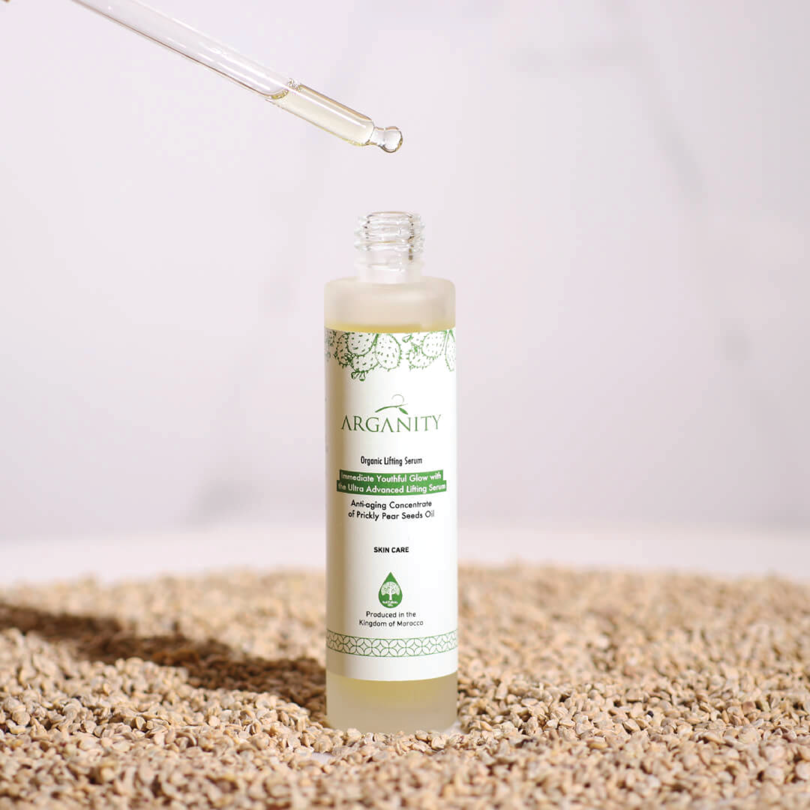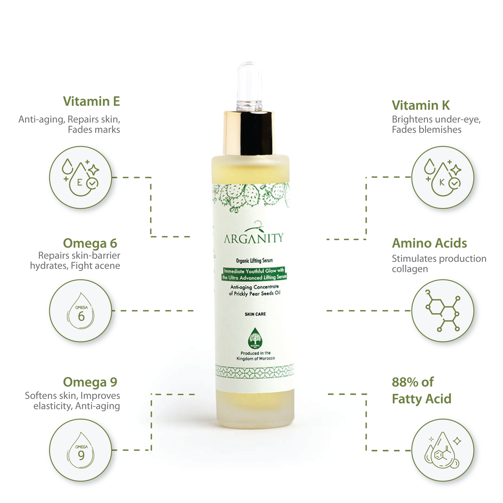 Unlock immediate firming and lifting effects with this potent serum, featuring pure argan oil of exceptional quality to visibly tighten and sculpt the skin. Designed for all skin types, it delivers a powerful lift to the face and neck, enhancing contours and reducing sagging for a more defined, youthful appearance.